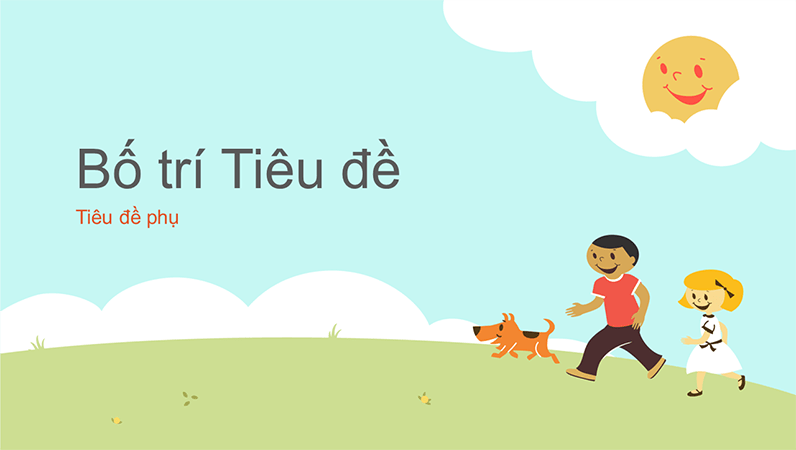 Trong nền của bản trình bày về giáo dục này, các cô bé và cậu bé hoạt hình đang chạy qua bãi cỏ hay chơi bập bênh cùng với chú chó cưng. Mây trắng như những con sóng trên bầu trời và mặt trời vui vẻ nhô lên trên trang chiếu tiêu đề. Mẫu này phù hợp với các giáo viên tiểu học, mẫu giáo hoặc các chương trình liên quan đến trẻ em. Đây là mẫu trợ năng.