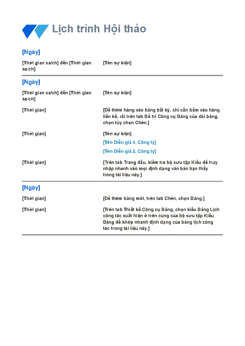 Chia sẻ lịch trình của cuộc họp hoặc hội thảo với mẫu lịch công tác này. Đây là mẫu trợ năng